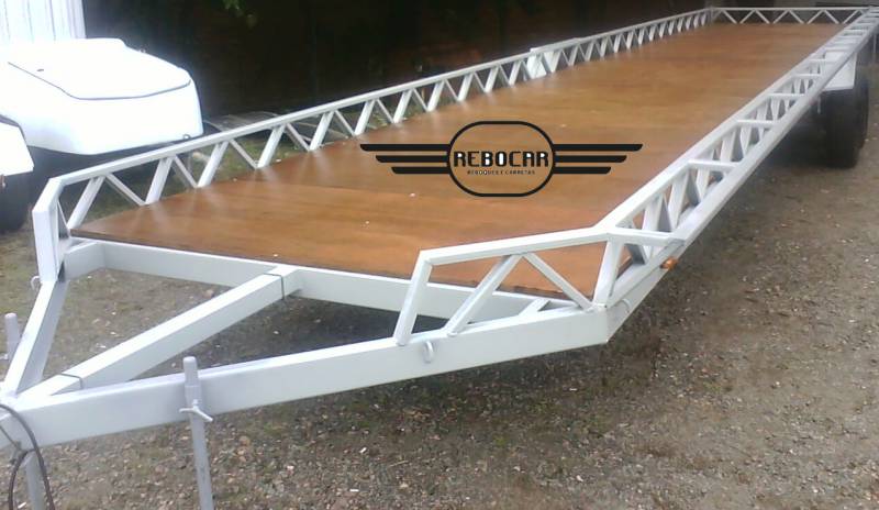 Este projeto foi desenvolvido visando atender uma necessidade especial. A finalidade é transportar piscinas de fibra de vidro. A piscina, que pode ter até 20 metros de comprimento, é amarrada apoiada sobre sua lateral.